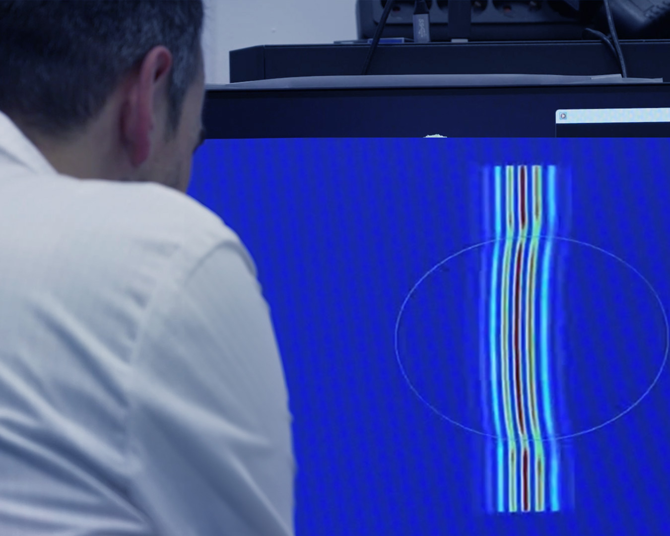 La base científica, construida sobre la interacción de señales desfasadas que generan estructuras geométricas precisas, nos permitió definir un sistema visual que no era decorativo, sino coherente con su funcionamiento. El símbolo no se diseñó para representar la empresa de forma abstracta, sino para reflejar la idea de precisión, intersección y reconstrucción que define su tecnología.